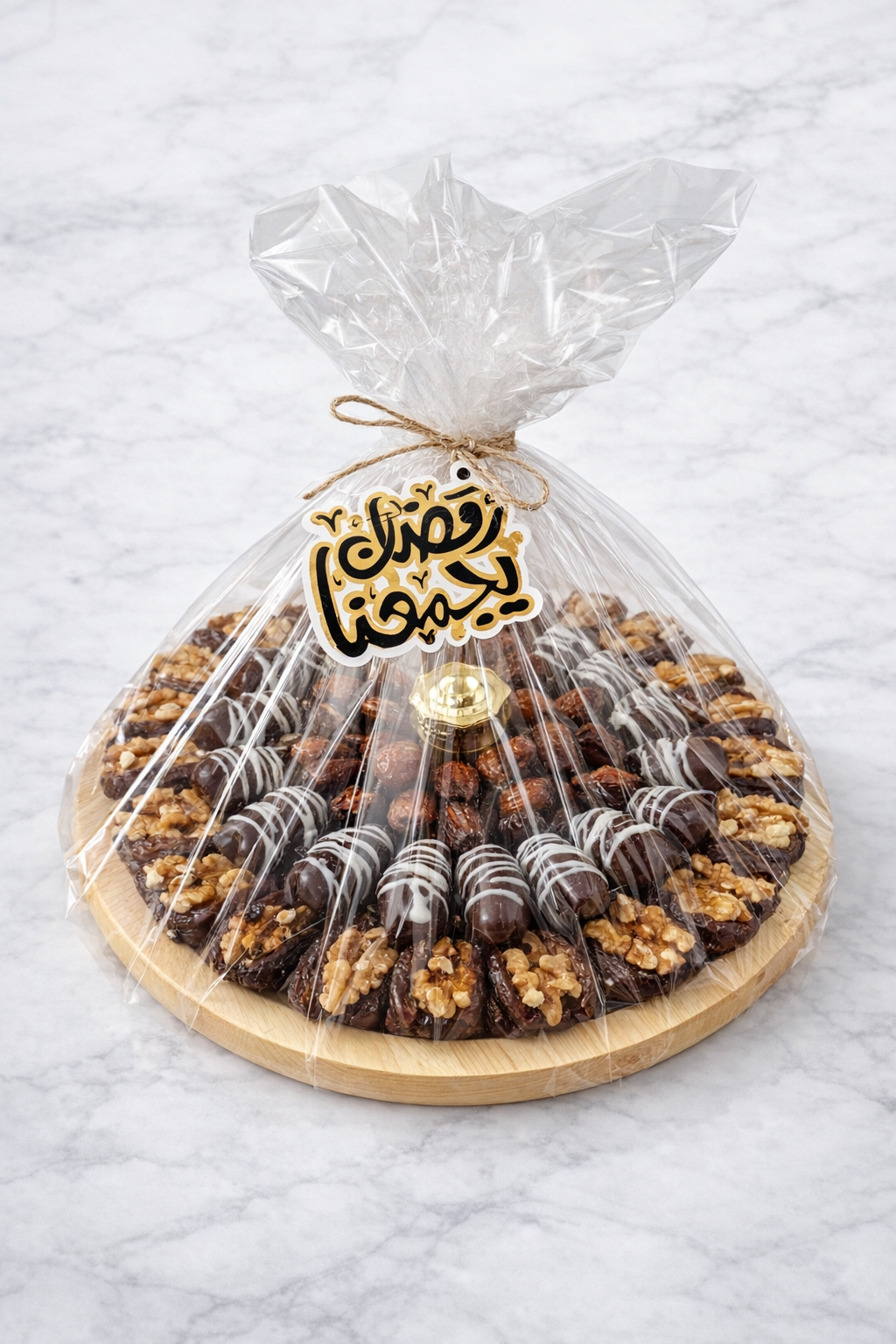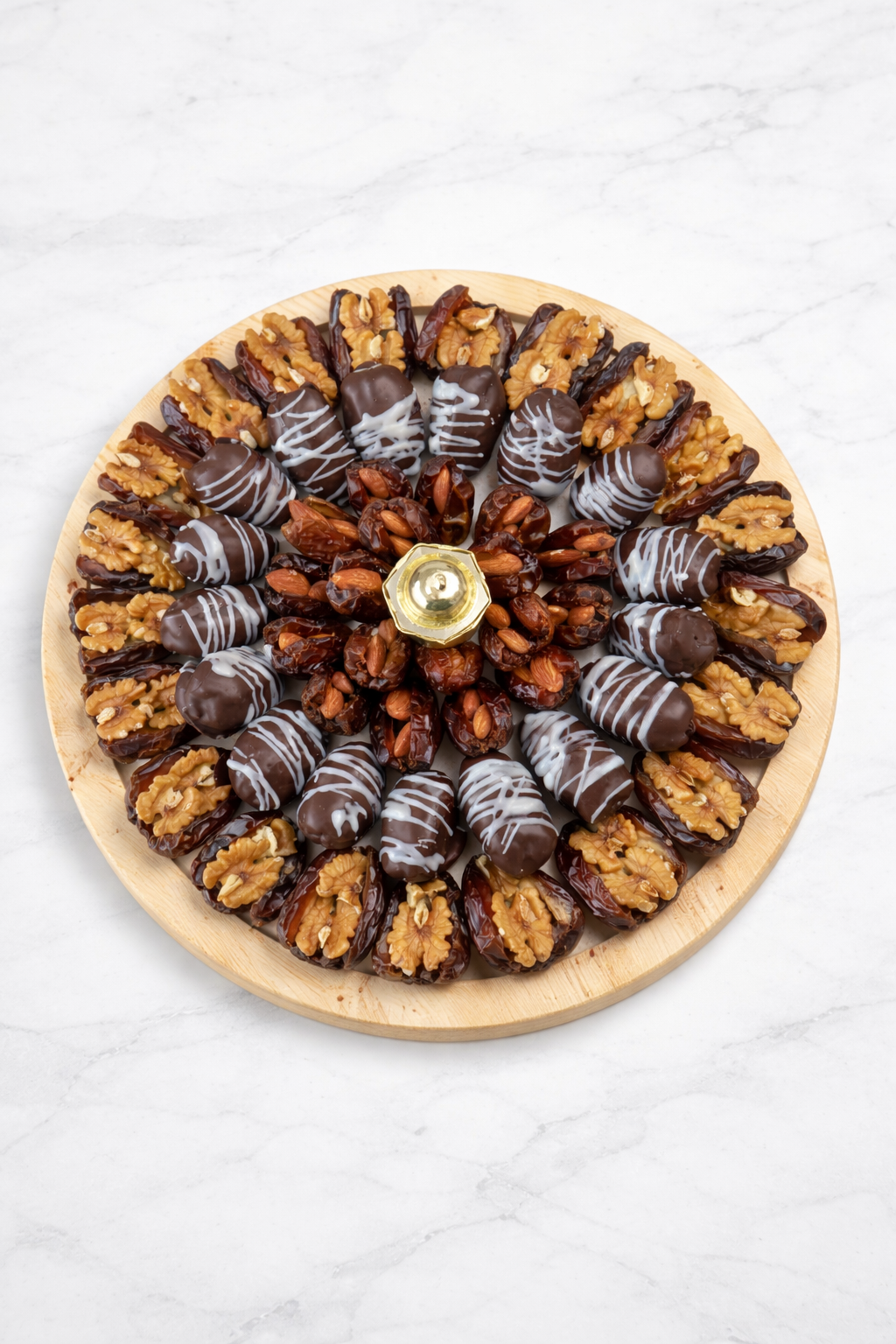 تشكيلة فاخرة من أجود أنواع التمر المجدود المحشو بالمكسرات، مرصوصة بتنسيق دائري أنيق يلفت الأنظار.