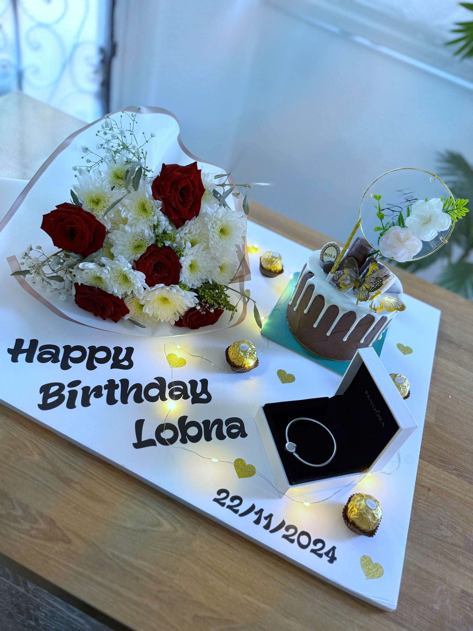 Featuring a fresh floral arrangement, premium chocolate cake, gourmet chocolates, and an elegant accessory — every detail is carefully selected to express love and appreciation with grace and style.